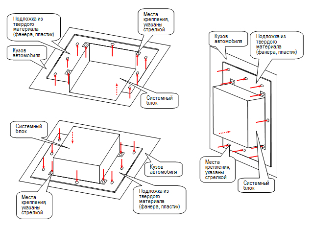 При монтаже (установке) системного блока в автомобиле, избегать перекосов планок крепления, для этого рекомендуется для начала прикрутить на место установки в машине подложку из толстого пластика или фанеры, а уже к ней прикручивать сам системный блок. Системный блок компьютера может быть закреплен в любом положении - горизонтально или вертикально, а также под различными углами. Это не влияет на его работу.